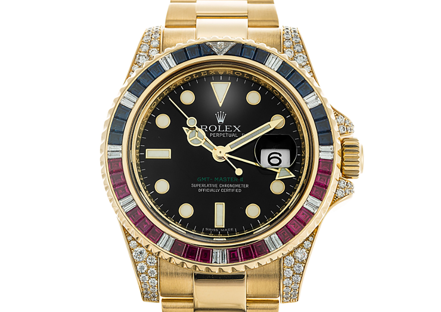 In ancient times, wearing rubies was thought to counteract the effects of poison, while sapphires were thought to exude heavenly rays. If this were true it would make any SARU wearer a kind of Marvel superhero. Boasting 23 diamonds, 18 sapphires and 18 rubies on the bezel, as well as 76 diamonds on the case, it’s unrivalled in the rarefied world of gem-set Rolexes.