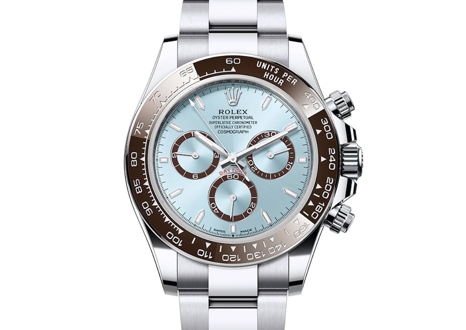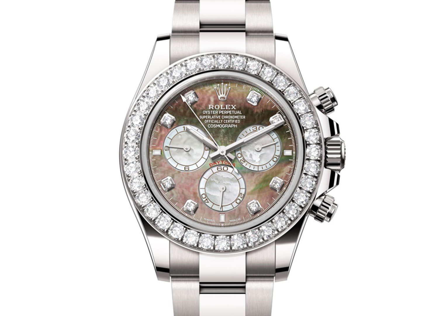 The Rolex line-up at Watches & Wonders 2023 brought us vibrant celebration dials and a Day-Date with emojis. The following year, Rolex returned to its conservative ways with a more subdued palette. But at least it served up one of the most impressive Daytonas of modern times, boasting a bewitching mother-of-pearl dial set within a diamond bezel. The case is 18k white gold and comes on a matching Oyster bracelet or a sportier Oysterflex rubber bracelet.