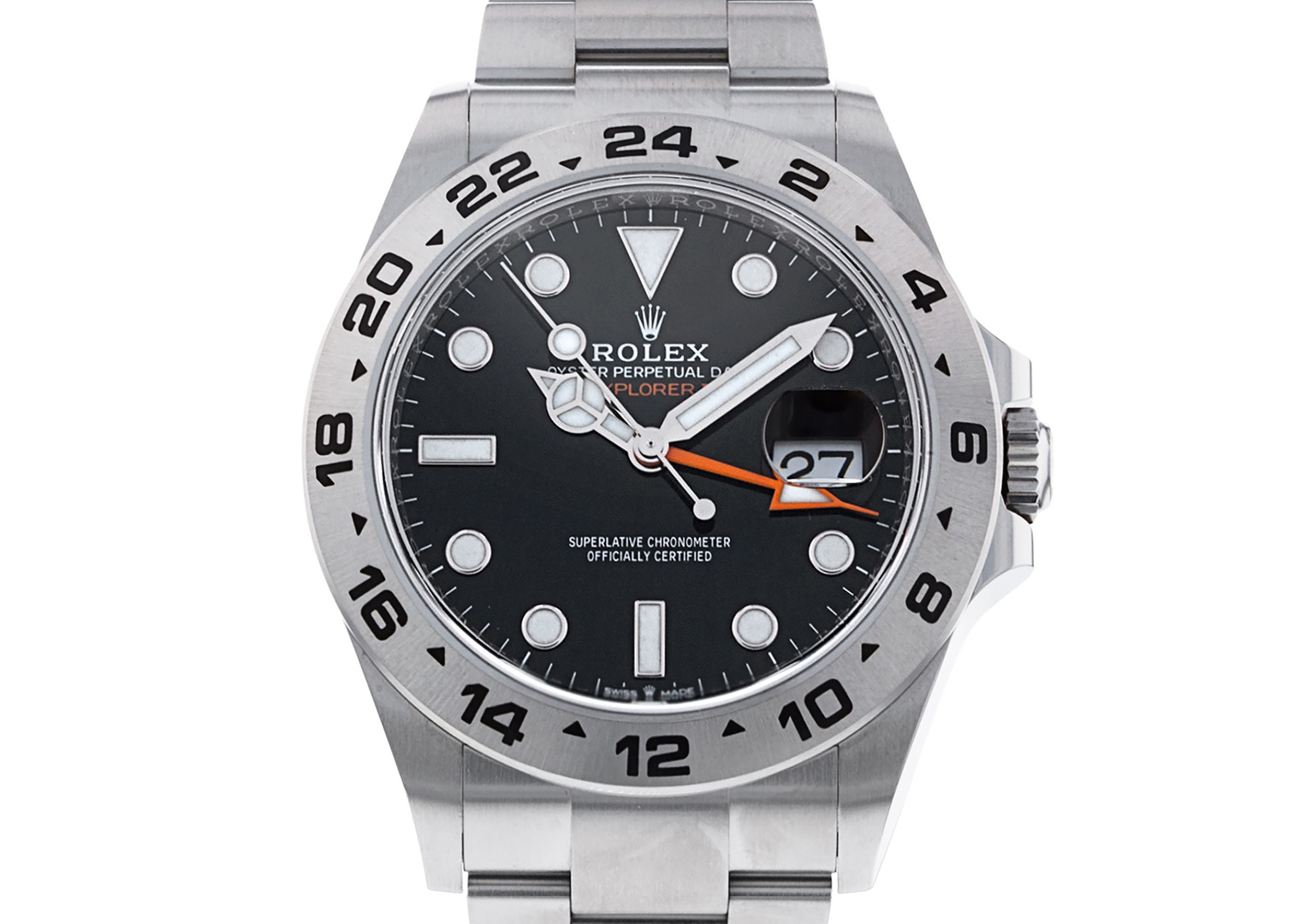 The watch of choice for polar explorers and cavers, the Explorer II is a purpose-built tool watch for people with rather niche professions and hobbies. Standout features include its fixed bezel with 24-hour graduations and the famous orange arrow-shaped 24-hour hand. Both work together to distinguish day from night—an essential for those working in extreme low light. Not only is the Explorer II functional, it looks great, too, no matter what colour dial—black or white—you choose.