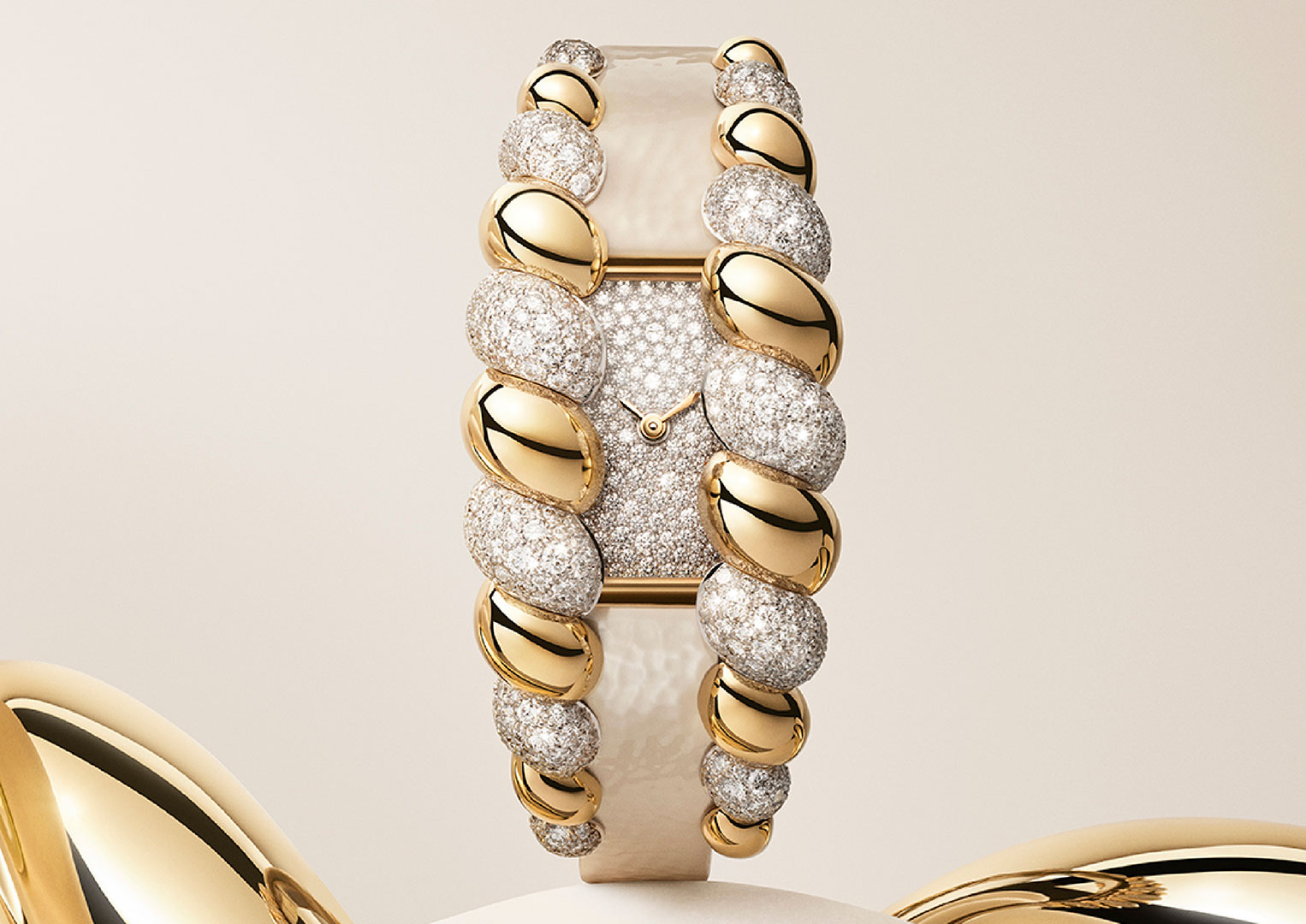 The standout model for us is the exquisite yellow and white gold version featuring a dial paved with snow-set diamonds with two-tone yellow-gold and pavé diamond twists on either side of it. The understated shiny beige leather strap completes this piece.