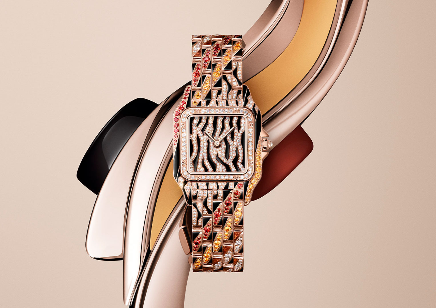 Featuring a combination of jewel-clad tiger and zebra stripes, this colourful timepiece boasts 145 snow-set brilliant-cut diamonds on the black lacquer dial, as well as a bracelet entirely paved with 314 brilliant-cut diamonds and 86 spessartites.